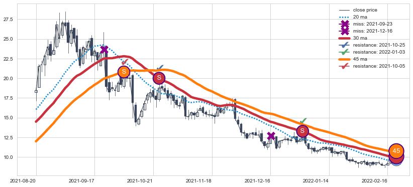 ⚄ 均线向上突破后价格上探力度低,正乖离率低,再次向下破位后维持原均线下跌趋势【强】