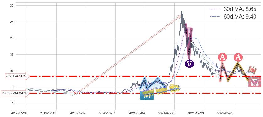 ♘ 支撑价格位3.085,可信任强度78.60%,距离最后交易2022-08-12形成的收盘价格8.65相差 -64.34%