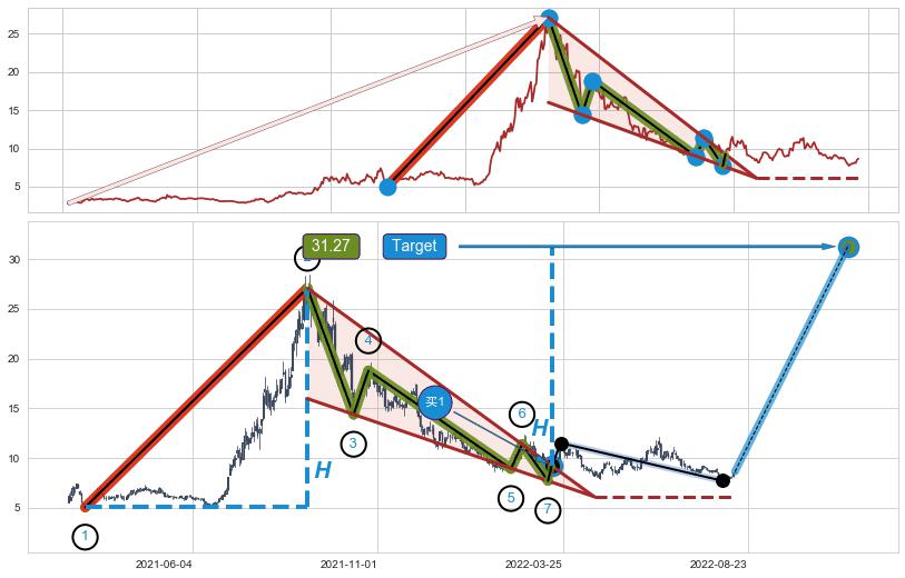 ➢ 最小中继整理涨幅→𝐇: 22.04 (𝐇楔型旗杆的长度:楔型起点→顶点)