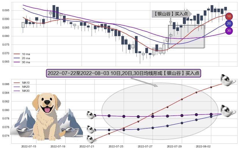 形态多维评估: ⚀ 2022-07-25-日至2022-08-03-日显现 10日-20日-30日均线 【银山谷】买入点 看多信号,后市看涨,买入