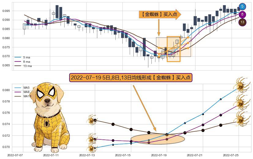形态多维评估: ⚀ 2022-07-19日显现 5日-8日-13日均线 【金蜘蛛】买入点 看多信号,后市看涨,买入