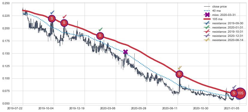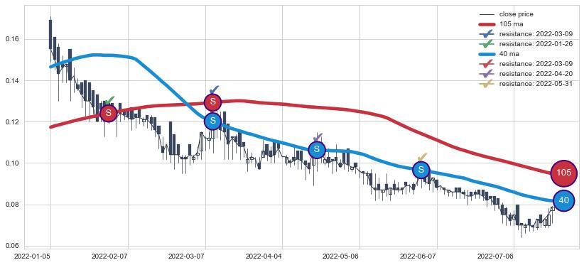 下跌趋势2022-01-05-2022-07-20,均线40, 105确认关键阻力4处
