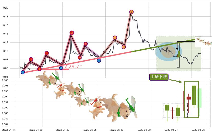 ♘ 支撑价格位0.0641172,可信任强度96.70%,距离最后交易2022-08-12形成的收盘价格0.0950000相差 -32.51%