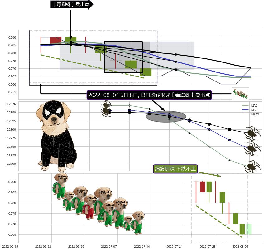 | 2 🅚:下跌螺旋桨 ➕ 🎢:【毒蜘蛛】卖出点均线组合卖出点信号形成后,猜想三条均线周期内的交易者都看空后市,持续下跌 ☞ 看空信号 ⇥ 【均线】交织【🅚线】⇥ 综合量化分数: 36 | > |