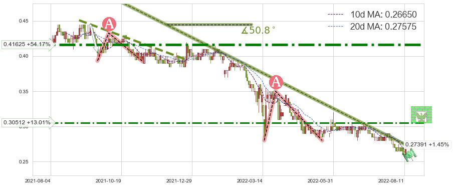 ♘ 阻力价格位0.41625,可信任强度94.95%,距离最后交易2022-08-12形成的收盘价格0.27000相差 +54.17%
