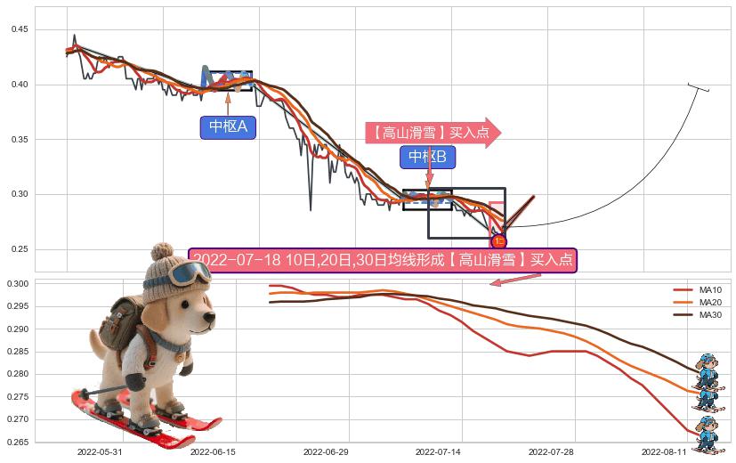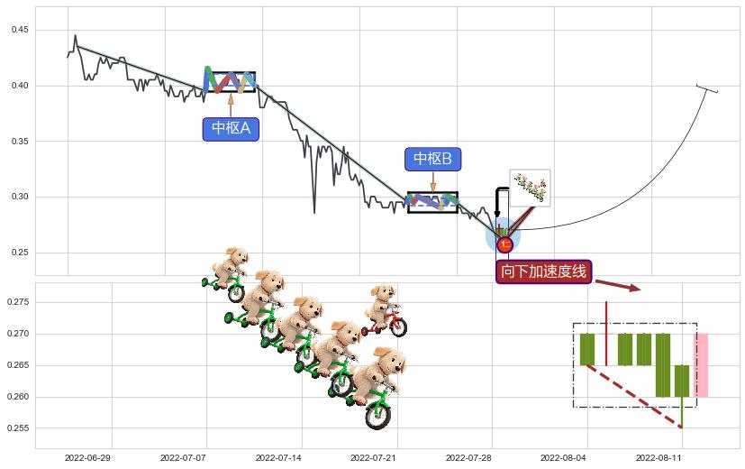 ➣ 【中枢B】:2022-05-30-2022-07-06,中枢由9笔构成,共26交易日, ZG=0.30000, ZD=0.29500