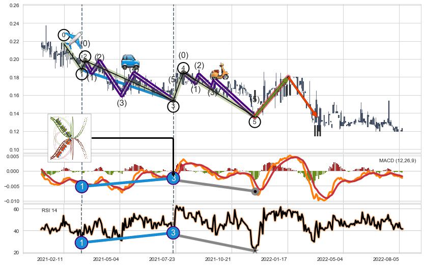 ➣ 第一, 三, 五浪下跌动能逐渐【衰弱变小】,趋势呈现不稳迹象