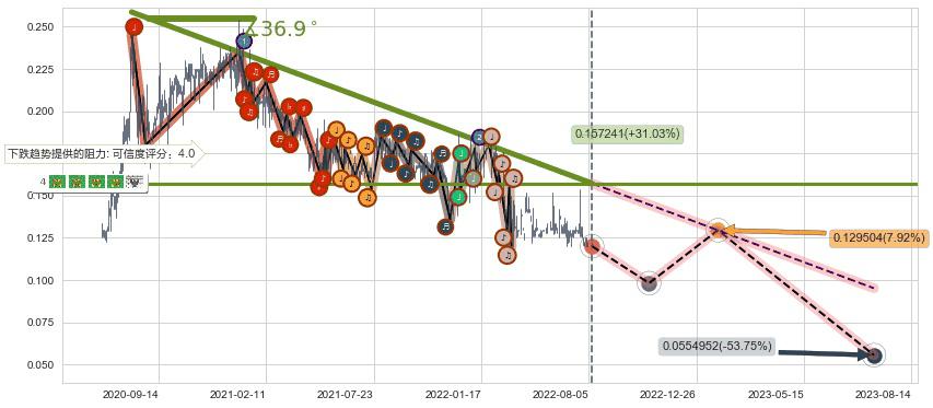 ♘ 在最后的下跌阶段2020-08-10至2022-05-11,存在 持续未破位的阻力位 ,阻力价格0.157241,可信任强度82.46%,其距离最后价格0.120000相差 +31.03%