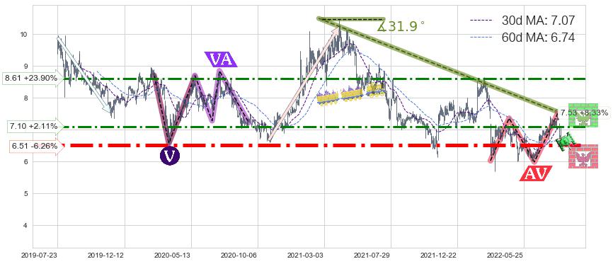 ♘ 阻力价格位7.10,可信任强度62.95%,距离最后交易2022-08-12形成的收盘价格6.95相差 +2.11%