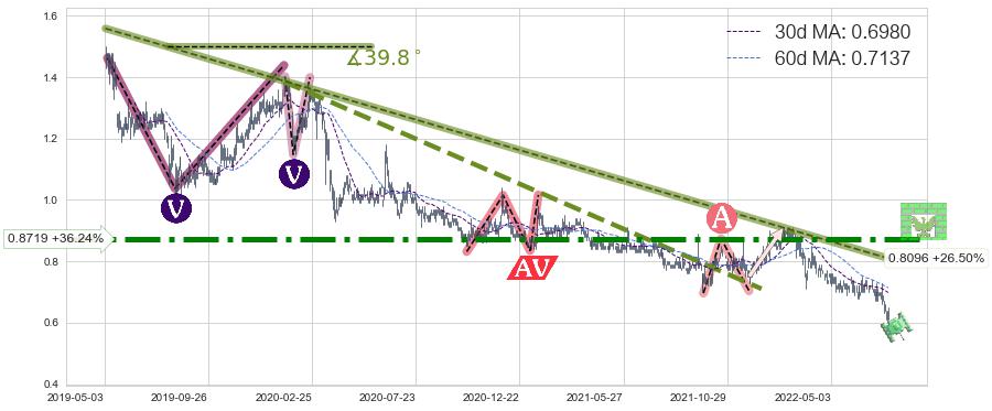 从2019-05-06至2022-08-11,共包含755个交易日,阶段股价下跌-70.26%,阶段股价变动位移路程比: 1 : 14,下跌趋势角度: 39.8