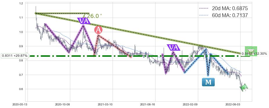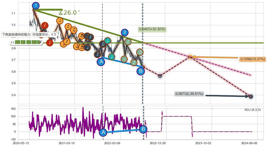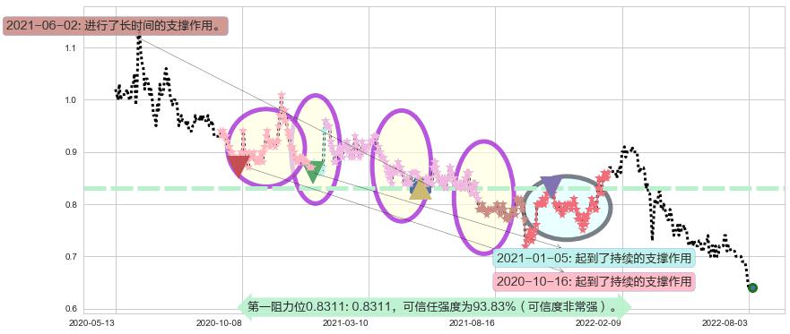 ♘ 在最后的下跌阶段2020-06-09至2022-08-11,存在 持续未破位的阻力位 ,阻力价格0.8467,可信任强度87.39%,其距离最后价格0.6400相差 +32.30%
