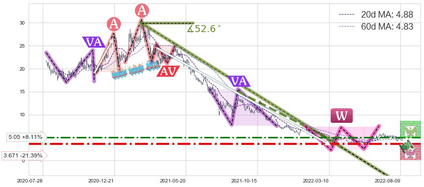 ♘ 支撑价格位3.671,可信任强度73.74%,距离最后交易2022-08-12形成的收盘价格4.67相差 -21.39%
