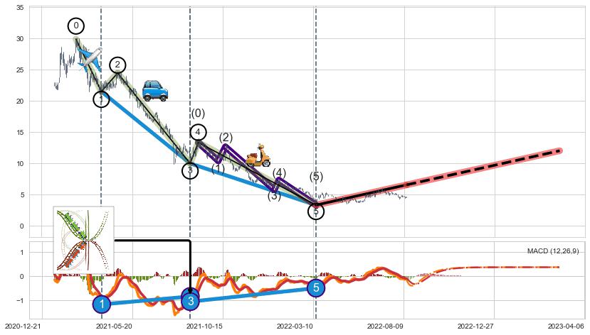 ➣ 第一, 三, 五浪下跌动能逐渐【衰弱变小】,趋势呈现不稳迹象