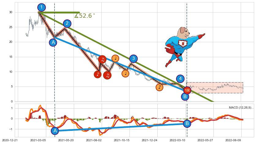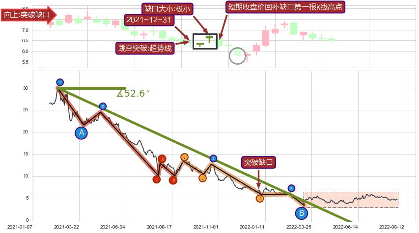 ➣ 2021-02-17-2022-04-01下跌趋势存在反转上涨[机会],其原下跌趋势的阻力位(-5.3246988)已被突破[强支撑信号],原下跌趋势角度: 52.6˚