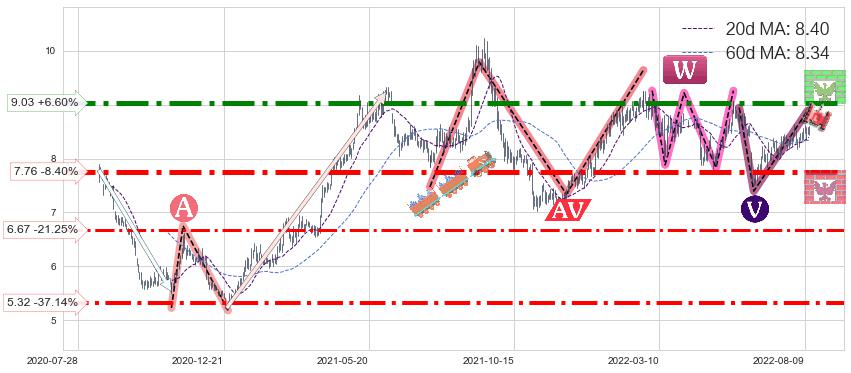 ♘ 支撑价格位7.76,可信任强度92.06%,距离最后交易2022-08-12形成的收盘价格8.47相差 -8.40%