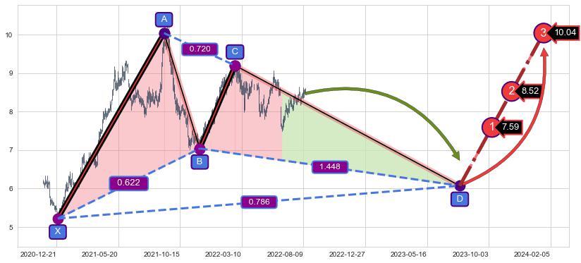 ➣ 未完成【伽利】形态起点X: 2020-12-23, 已到达C点: 2022-02-23, 预测最终D点: 2023-07-28, 共614交易日