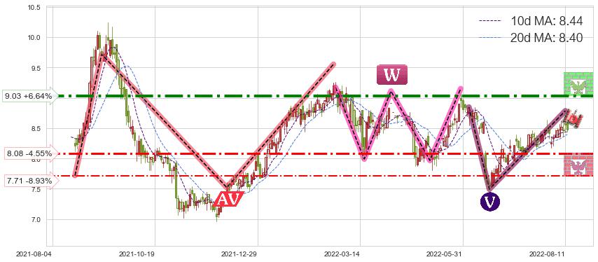 ♘ 支撑价格位8.08,可信任强度67.00%,距离最后交易2022-08-12形成的收盘价格8.47相差 -4.55%