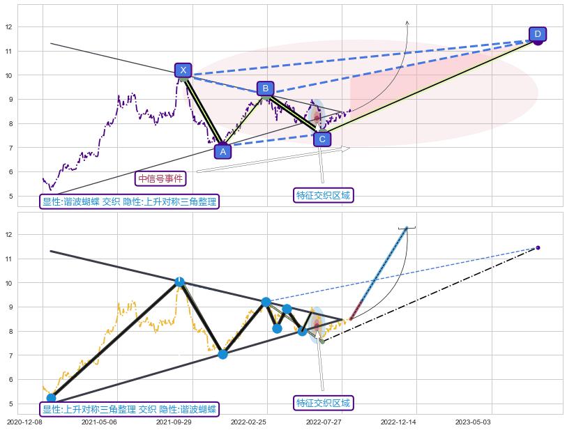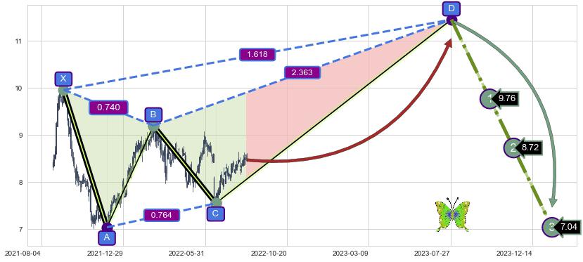 ➣ 未完成【蝴蝶】形态起点X: 2021-09-10, 已到达C点: 2022-06-20, 预测最终D点: 2023-07-28, 共474交易日