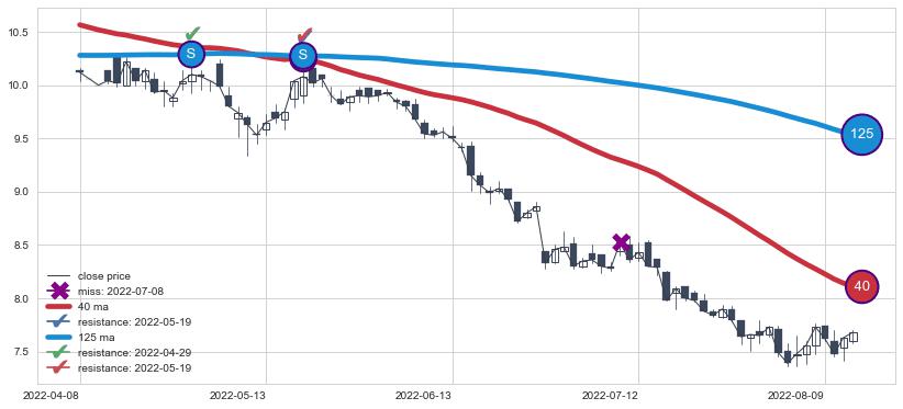 下跌趋势2022-04-08-2022-08-12,均线40, 125确认关键阻力2处