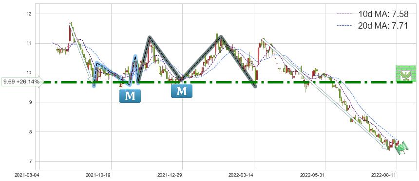 ♘ 阻力价格位9.69,可信任强度90.55%,距离最后交易2022-08-12形成的收盘价格7.68相差 +26.14%
