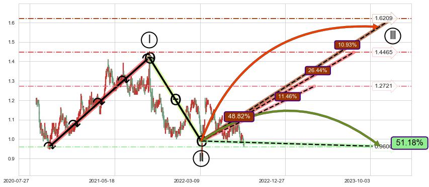 ➣ 调整浪已超过预测的c点位置,但后续大趋势循环浪高概率反转下跌,继续上涨概率48.82%,谨慎做多