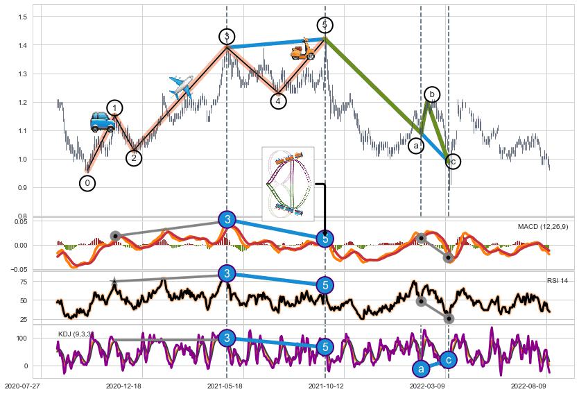 ➢ 1,3,5驱动浪MACD, RSI, KDJ走势都出现【常规背离】反转信号增强
