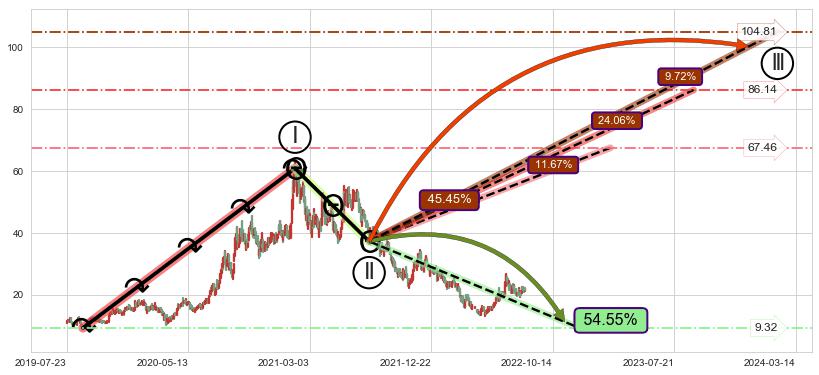 ♘ 支撑价格位10.93,可信任强度86.19%,距离最后交易2022-08-12形成的收盘价格21.75相差 -49.77%
