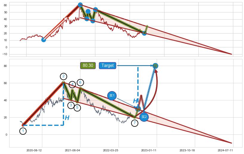 ➢ 最小中继整理涨幅→𝐇: 50.08 (𝐇楔型旗杆的长度:楔型起点→顶点)