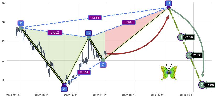 ➣ 未完成【蝴蝶】形态起点X: 2021-12-31, 已到达C点: 2022-08-03, 预测最终D点: 2023-01-09, 共252交易日