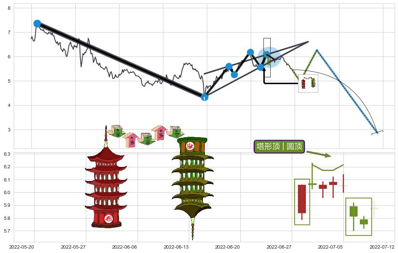 | 22 🅚:塔形顶 | 圆顶 ➕ 🌊:波浪理论下跌5浪延续:猜想C点强阻力小反弹终止,猜想保持下跌5浪方向下行(均值回复后大周期继续趋势跟踪) ☞ 看空信号 ⇥ 【🅚线】交织【图形】⇥ 综合量化分数: 46 | > |