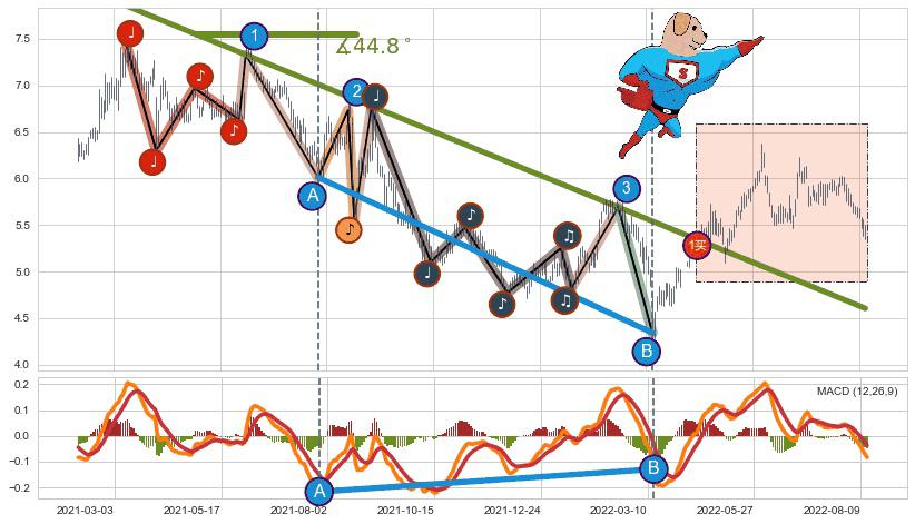 ➣ 2021-03-11-2022-05-25下跌趋势存在反转上涨[机会],其原下跌趋势的阻力位(4.60)已被突破[强支撑信号],原下跌趋势角度: 44.8˚