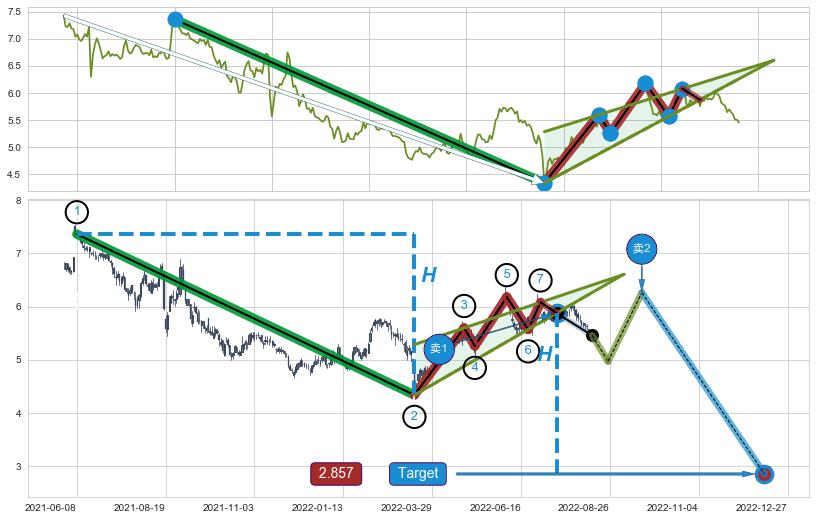 ➢ 最小中继整理跌幅→𝐇: 3.020 (𝐇楔型旗杆的长度:楔型起点→顶点)