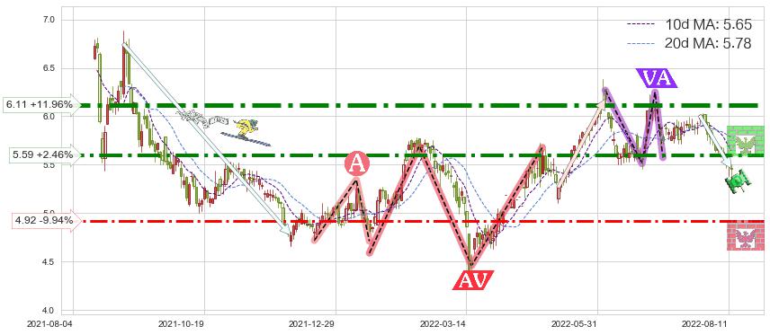 ♘ 阻力价格位5.59,可信任强度78.31%,距离最后交易2022-08-12形成的收盘价格5.46相差 +2.46%