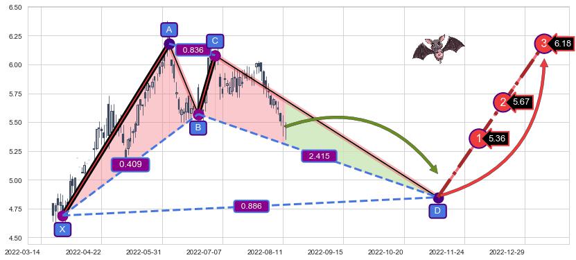 ➣ 未完成【蝙蝠】形态起点X: 2022-03-25, 已到达C点: 2022-07-04, 预测最终D点: 2022-11-09, 共156交易日