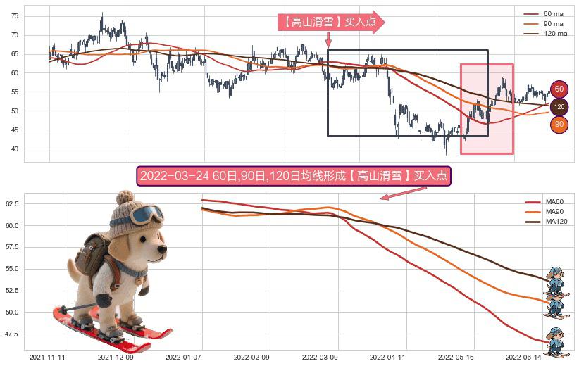⚀ 2022-01-07日-2022-06-16日显现 60日-90日-120日均线 【高山滑雪】买入点 看多信号,后市看涨,买入