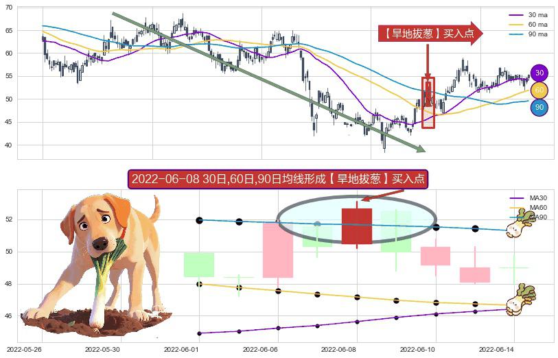 ⚀ 2022-06-08日显现 30日-60日-90日均线 【旱地拔葱】买入点 看多信号,后市看涨,买入