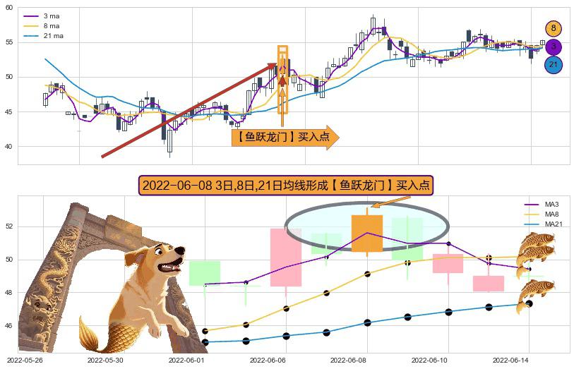 ⚀ 2022-06-08日显现 3日-8日-21日均线 【鱼跃龙门】买入点 看多信号,后市看涨,买入
