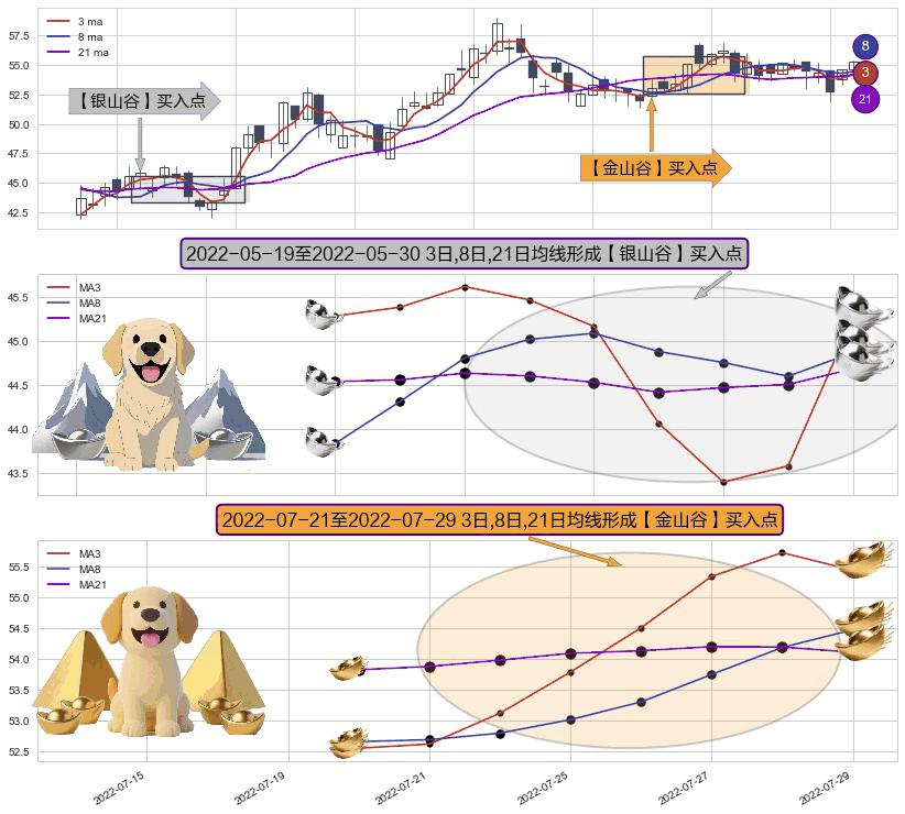 ⚂ 2022-07-22-日至2022-07-29-日显现 3日-8日-21日均线 【金山谷】买入点 其再次确认了买入信号,可靠性更强,买入
