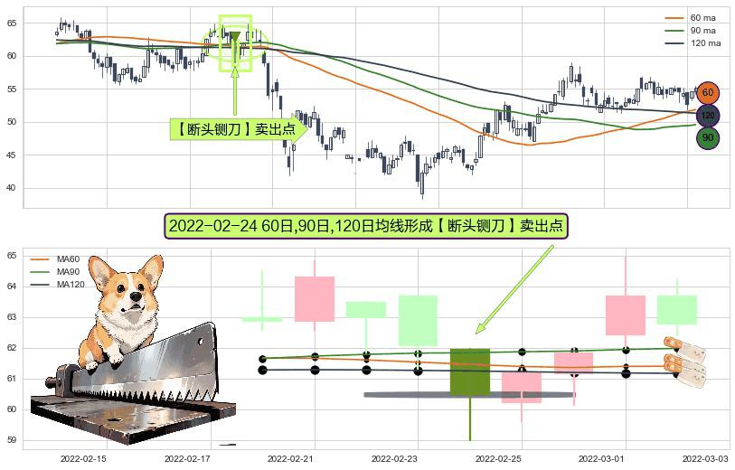⚀ 2022-02-24日显现 60日-90日-120日均线 【断头铡刀】卖出点 看空信号,后市看跌,卖出