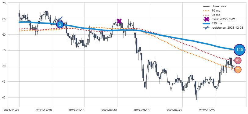 2022-03-07至2022-06-13 慢线与快线呈空头排列, 慢线与快线接触少,无缠绕
