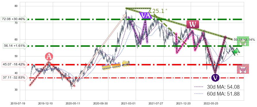 ♘ 阻力价格位56.14,可信任强度88.54%,距离最后交易2022-08-12形成的收盘价格55.25相差 +1.61%