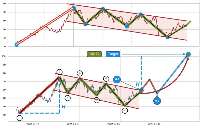 ➢ 最小中继整理跌幅→𝐇: 22.77 (低点逐步抬高斜边第一支撑点②与阻力边垂直距离)