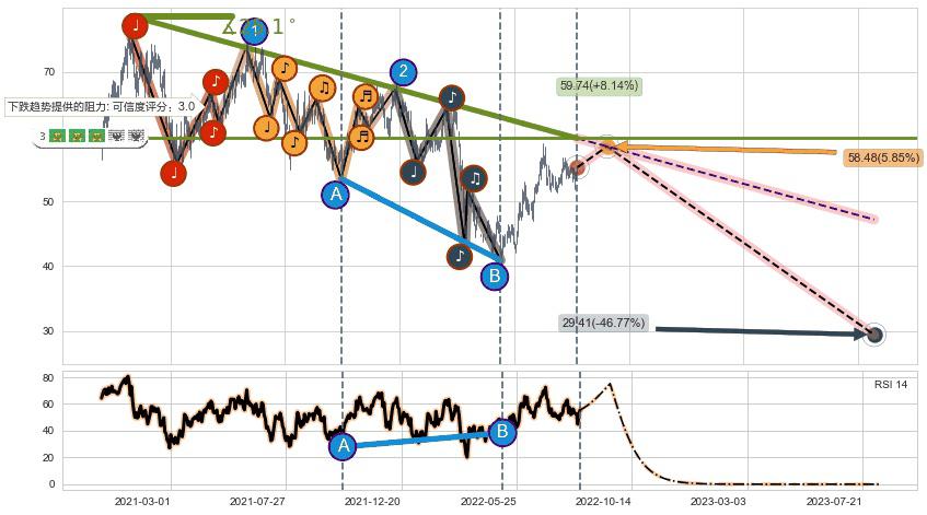 ♘ 在最后的下跌阶段2021-01-08至2022-06-07,存在 持续未破位的阻力位 ,阻力价格59.74,可信任强度73.08%,其距离最后价格55.25相差 +8.14%