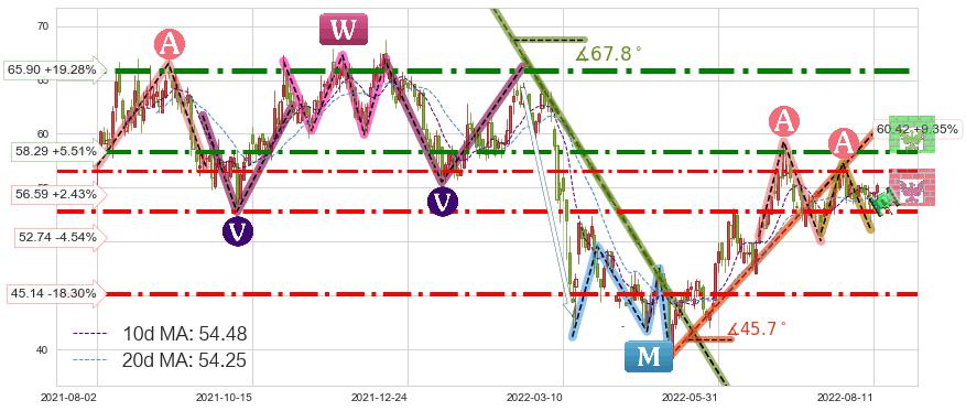 ♘ 支撑价格位56.59,可信任强度58.47%,距离最后交易2022-08-12形成的收盘价格55.25相差 +2.43%