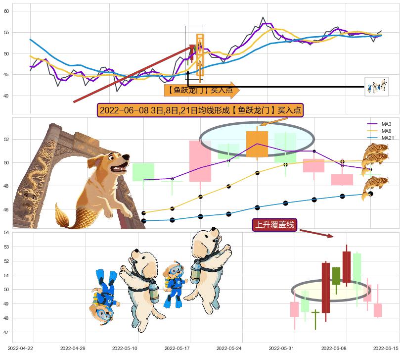 | 2 🅚:旭日东升 ➕ 🎢:【鱼跃龙门】买入点均线组合买入点信号形成后,猜想后续充分蓄势之后,上涨突破关键阻力位 ☞ 看多信号 ⇥ 【均线】交织【🅚线】⇥ 综合量化分数: 52 | > |