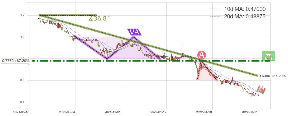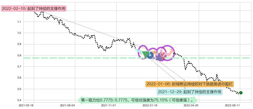 ♘ 阻力价格位0.7775,可信任强度75.15%,距离最后交易2022-08-12形成的收盘价格0.46500相差 +67.20%