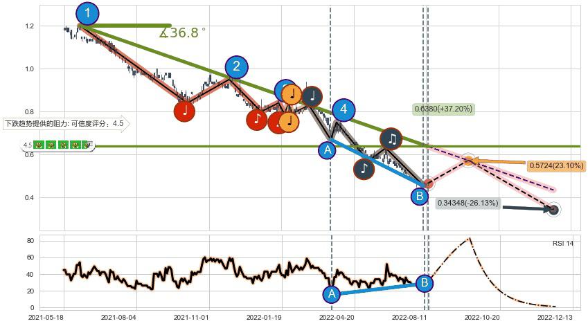 ♘ 在最后的下跌阶段2021-06-04至2022-08-12,存在 持续未破位的阻力位 ,阻力价格0.6380,可信任强度87.84%,其距离最后价格0.46500相差 +37.20%