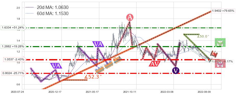 ➣ D点拟合预测价格0.35370,距离最后交易收盘价格1.0800相差 -67.25%
