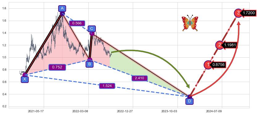 ➣ 未完成【蝴蝶】形态起点X: 2021-01-08, 已到达C点: 2022-03-29, 预测最终D点: 2023-12-18, 共733交易日