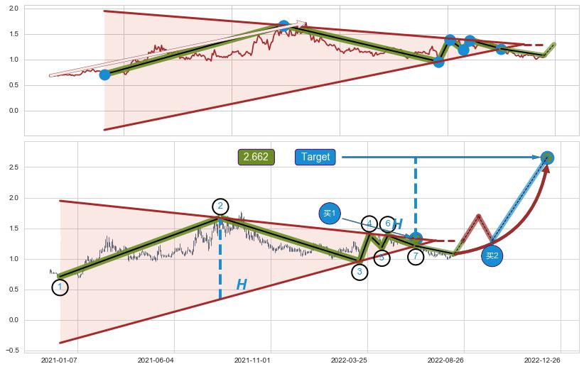 ➢ 最小中继整理涨幅→𝐇: 1.3307 (高点逐步降低斜边第一阻力点②与支撑边垂直距离)